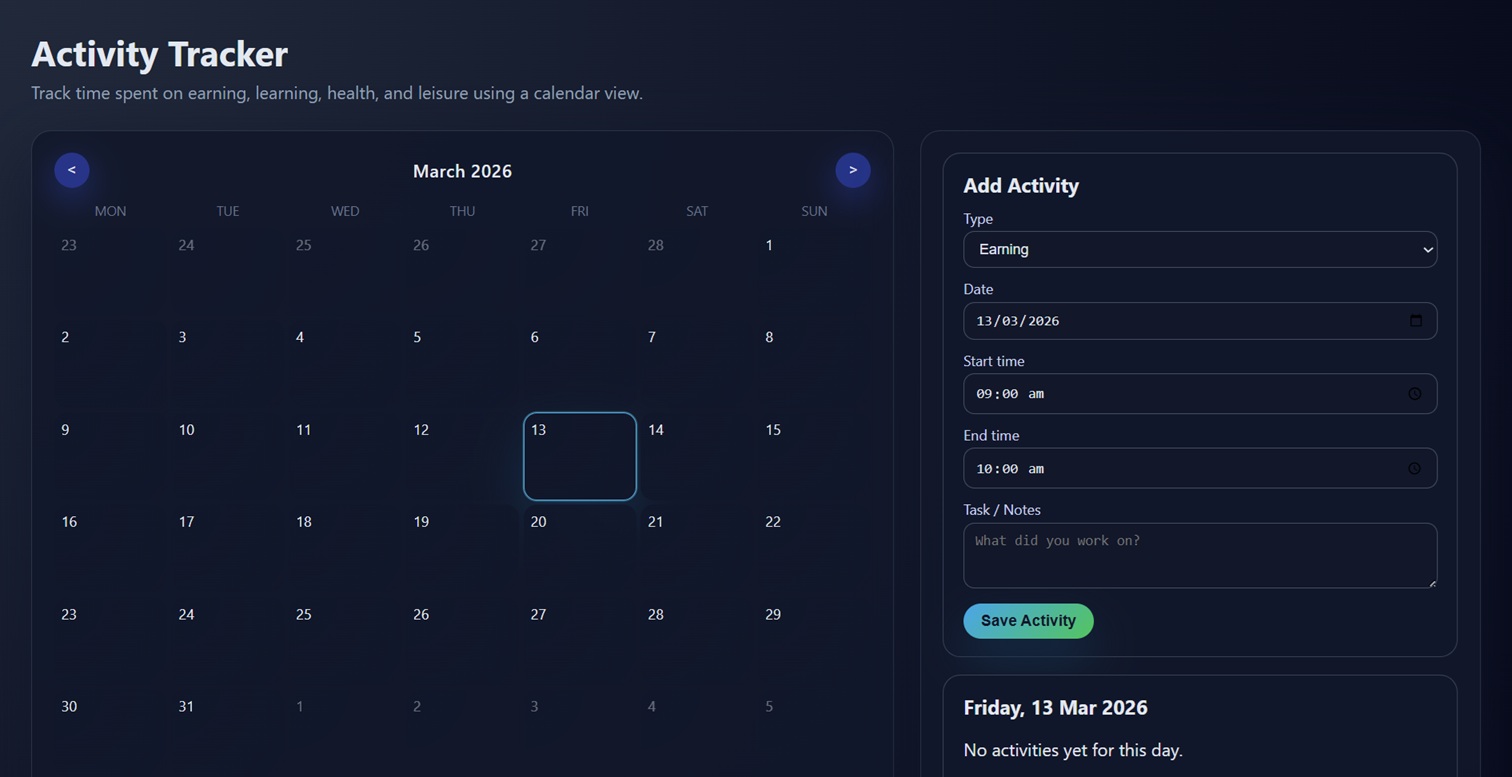 A personal web app that logs daily activities and visualises how you spend your time across categories such as work, exercise, learning, and rest.